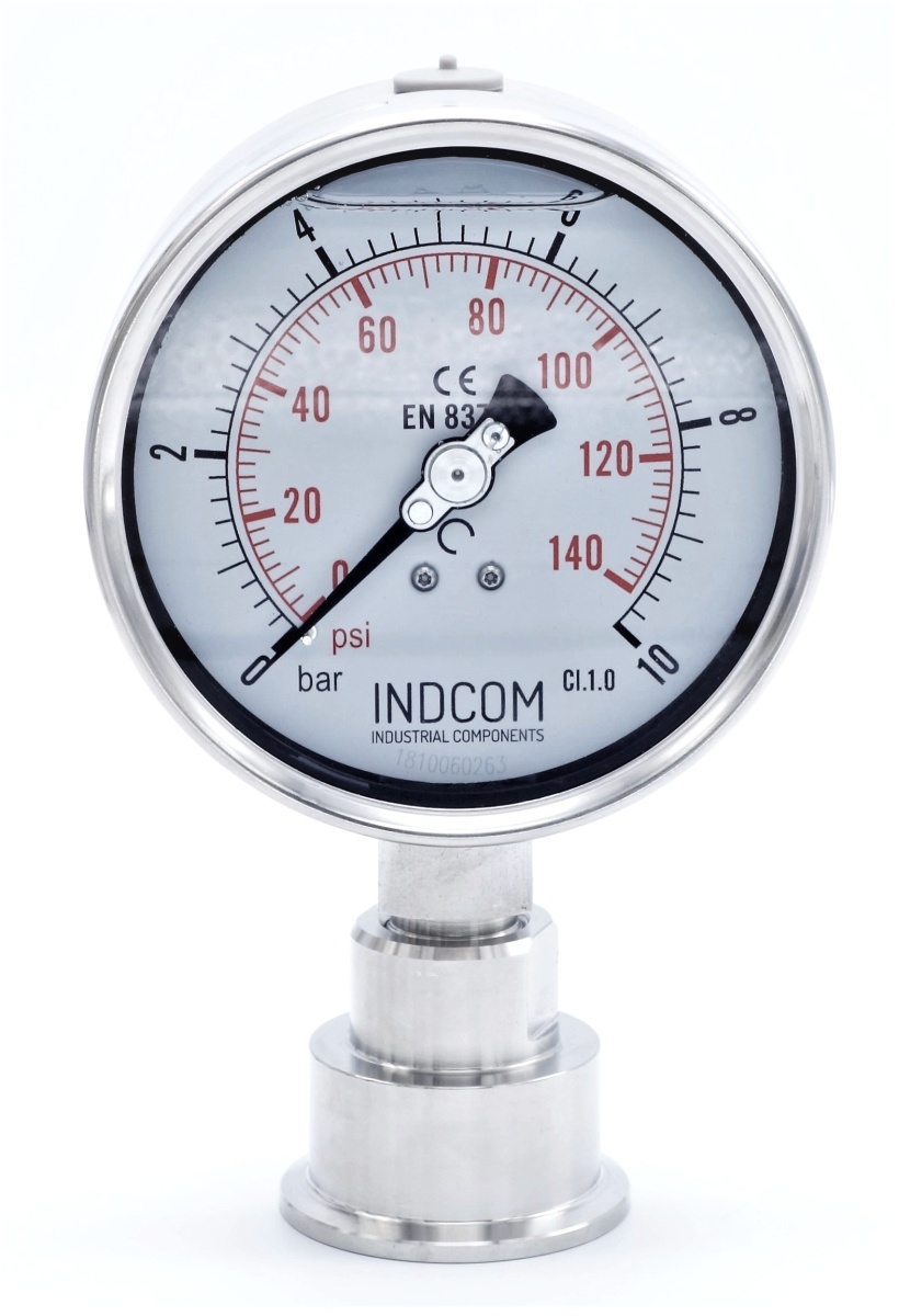 Celonerezový tlakoměr, číselník 100 mm, s oddělovací membránou CLAMP DIN32676 - límeček 50.5 mm