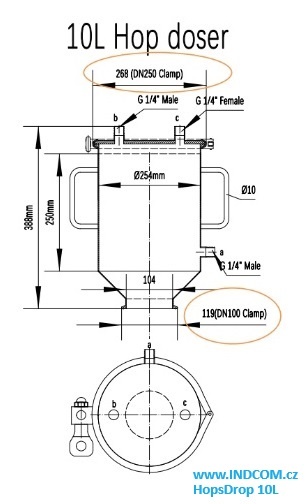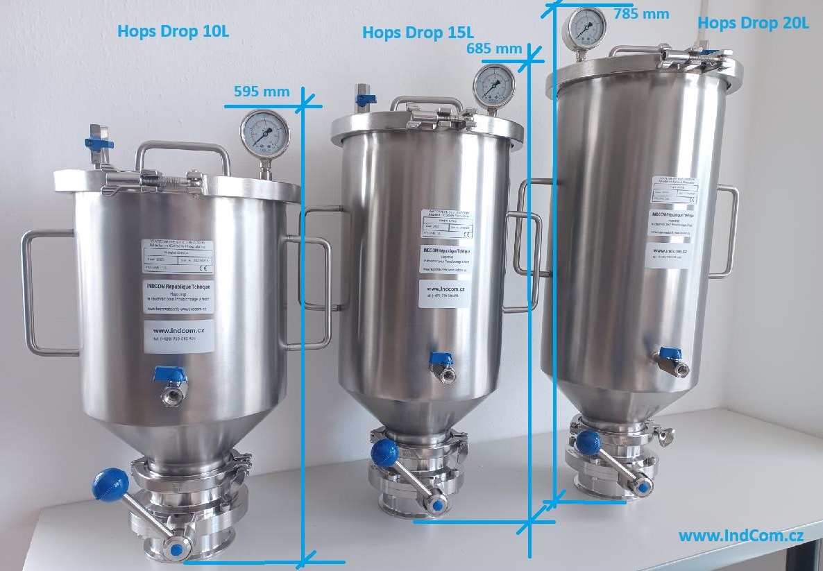 HopsDrop se obecně skládá z přímé klapky DN 100, která je upevněna na fermentoru (lze upravit podle vašeho připojení na fermentoru). Dále má HopsDrop dole 1/4" BSP ventil pro přívod CO2, který tlačí kyslík do 1/4" BSP ventilu nahoře na víku. Na krytu je také instalován manometr 0-4Bar.