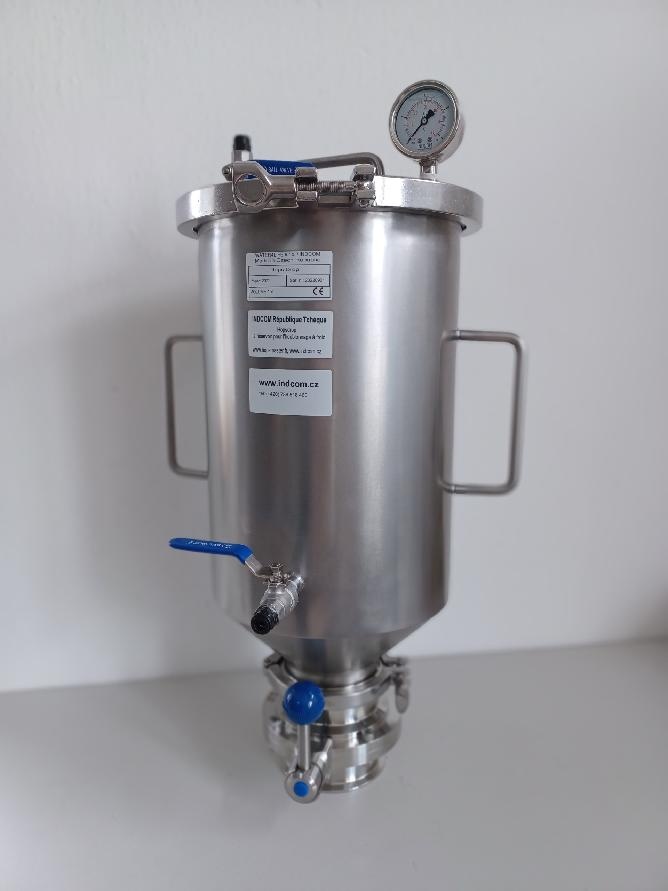 Nádoba pro studené chmelení, k připojení na horní klenuté dno tanku a pro dávkování granulovaného chmele při vyrovnání tlaku.