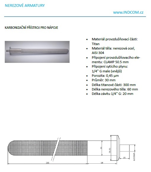 Karbonizační přístroj se používá pro sycení hotového nápoje (piva, limonády, cideru) uvnitř tanku sterilním vzduchem, CO2 nebo dusíkem. Díky konstrukci tohoto elementu je možné dosáhnout vytvoření velmi jemné bubliny a docílit tak při dané teplotě nápoje a tlaku potřebného nasycení nápoje. Provzdušňovací element je možné rovněž použít i pro nasycení zchlazené mladiny před jejím zakvašením na spilce či v cylindrokónickém kvasném tanku.