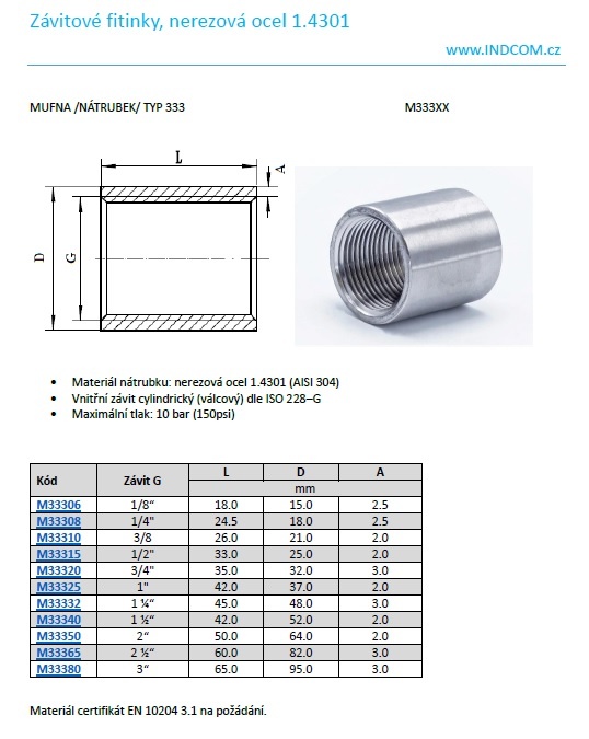 Mufna - typ 333, šroubovací nátrubek s vnitřním závitem na obou koncích (pro závitové spojení trubek v přímém směru).